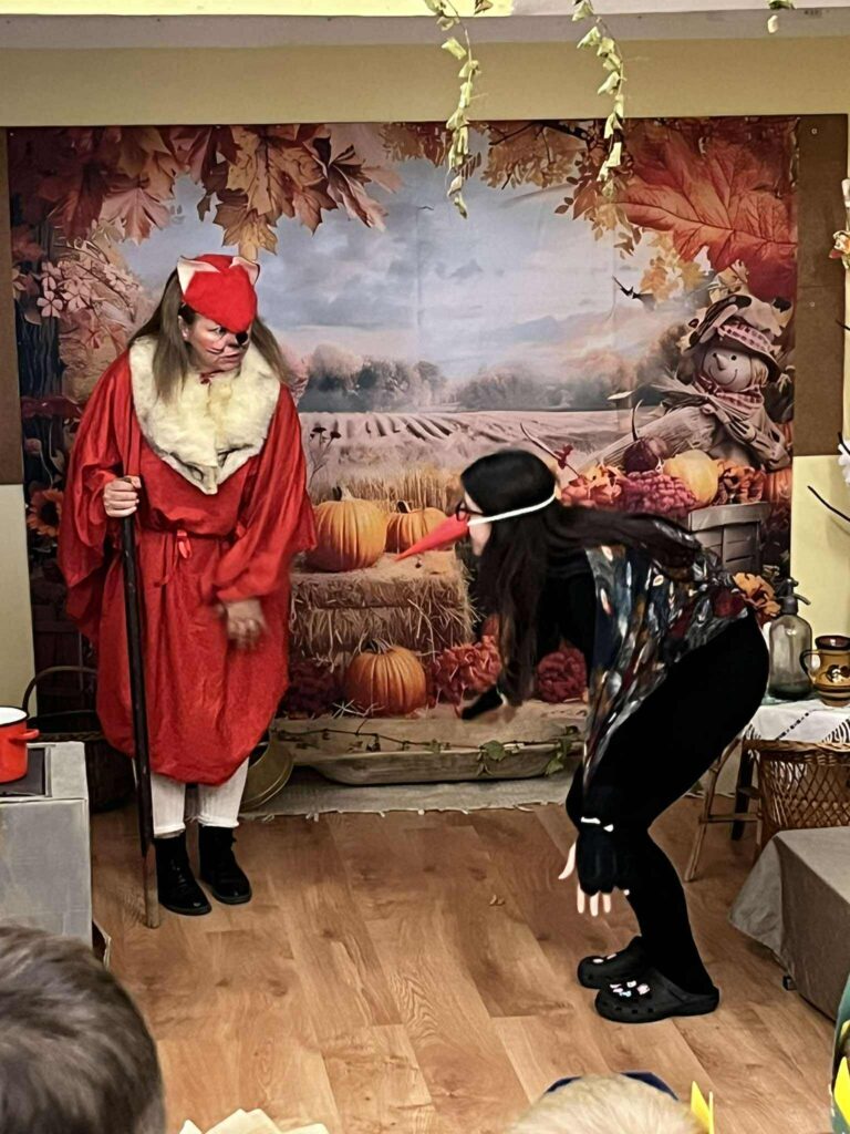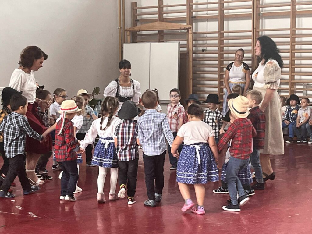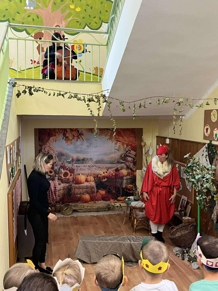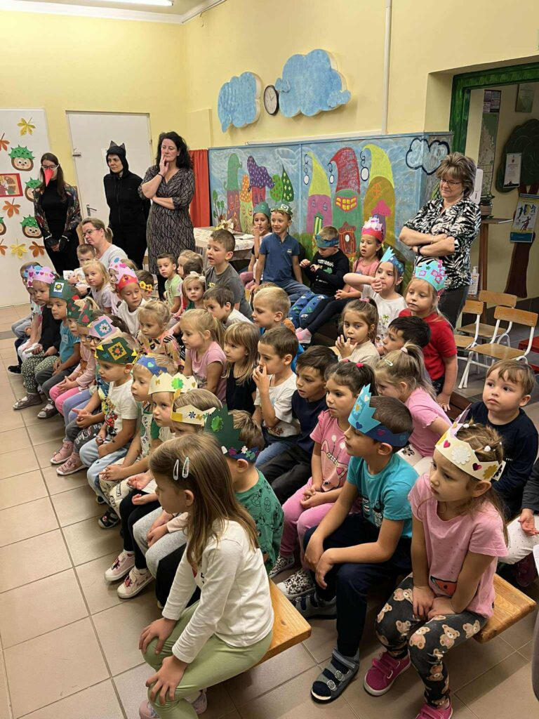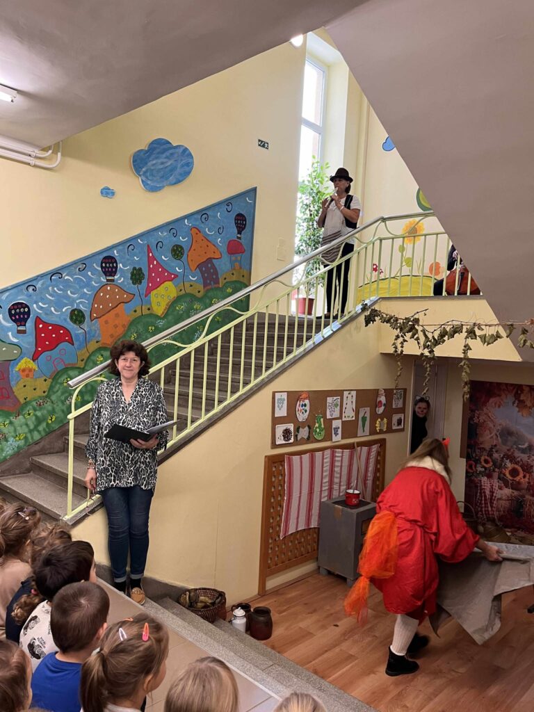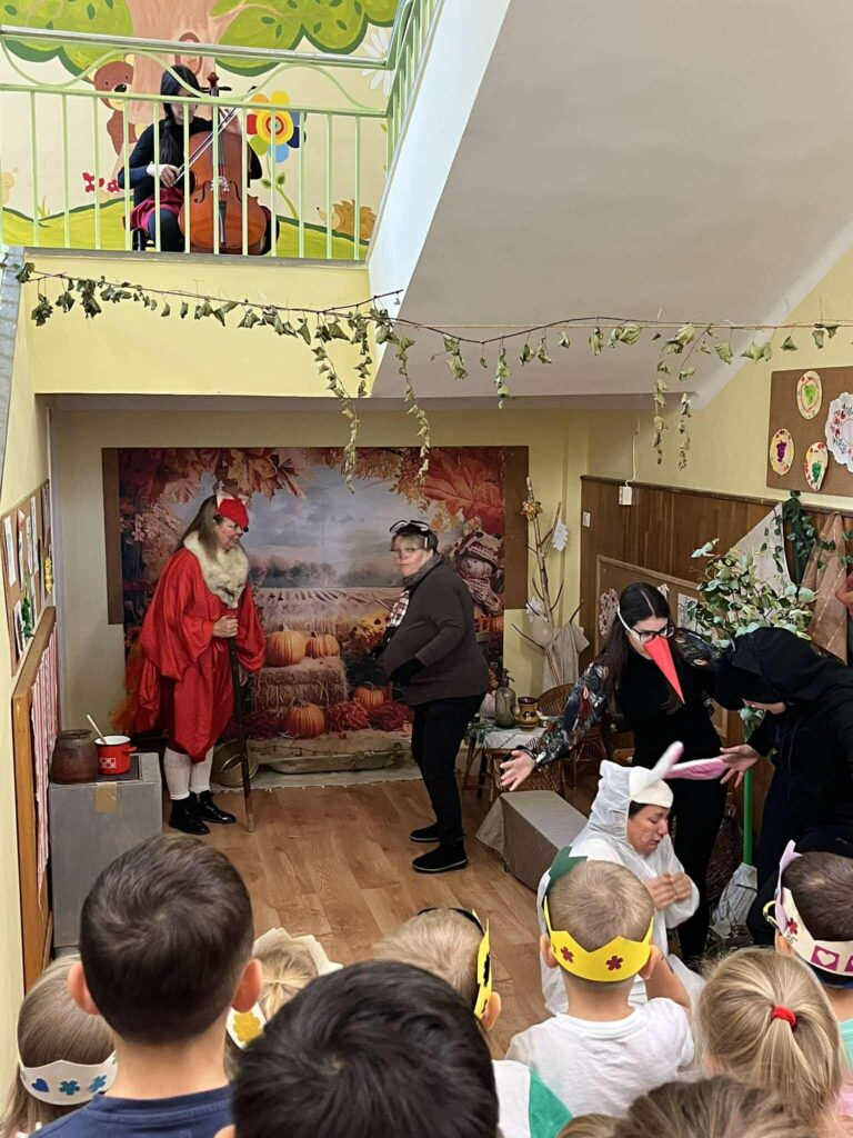 A program fénypontja az volt, amikor az óvodapedagógusok egy általuk kiválasztott, sok szereplős népmesét, a „Kacor királyt” dramatizálták. A gyerekek csillogó szemmel figyelték az előadást, nevetéssel és tapssal kísérve a jól ismert fordulatokat. Mindannyiunk számára nagy élmény volt ez a nap – hiszen az előadás során kiszakadhattunk kicsit a hétköznapokból, és még közelebb kerültünk egymáshoz és a gyerekekhez is. Ezek a közös élmények minden alkalommal erősítik az óvodai közösséget, a szocializációt, mélyítik a bizalmi kapcsolatokat és a humor által mindenkiből előcsalogatják a pozitív érzelmeket.