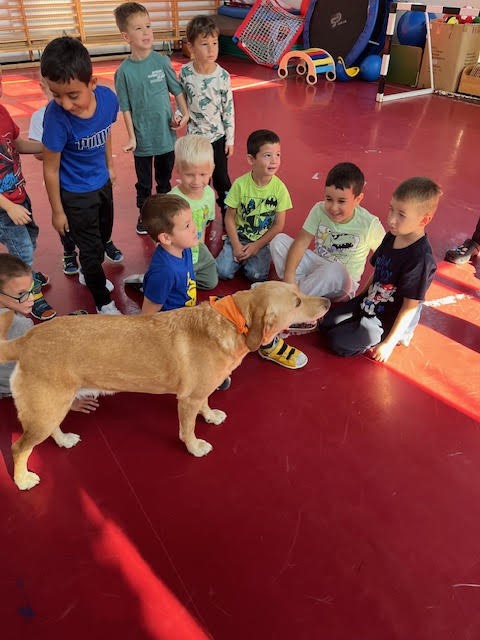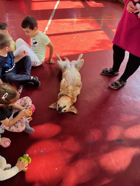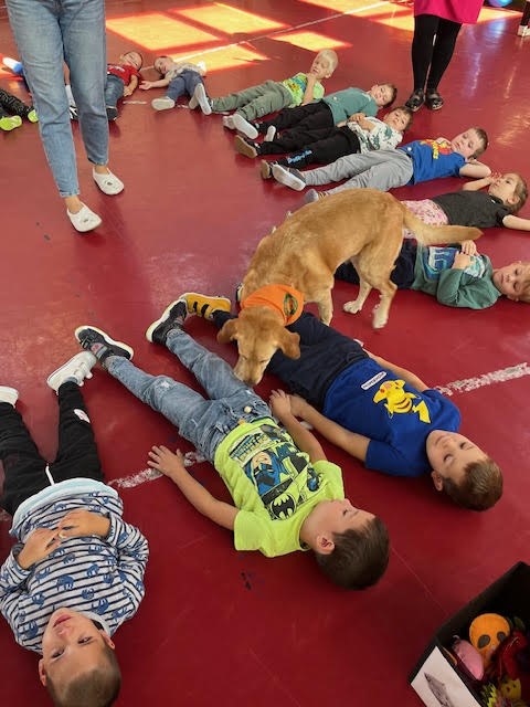 Kedden a Csiga és a Süni csoport részt vett egy különleges, kutyás terápiás foglalkozáson a tornateremben. A program nagy sikert aratott a gyerekek körében, különösen Ella, a terápiás kutya volt a kedvencük. Mindenki örömmel simogatta, játszott vele, és a foglalkozás végére még a félénkebb gyerekek is feloldódtak. Játékos feladatokat végeztek a gyermekek a kutyussal. Örömteli, élménygazdag foglalkozás volt.